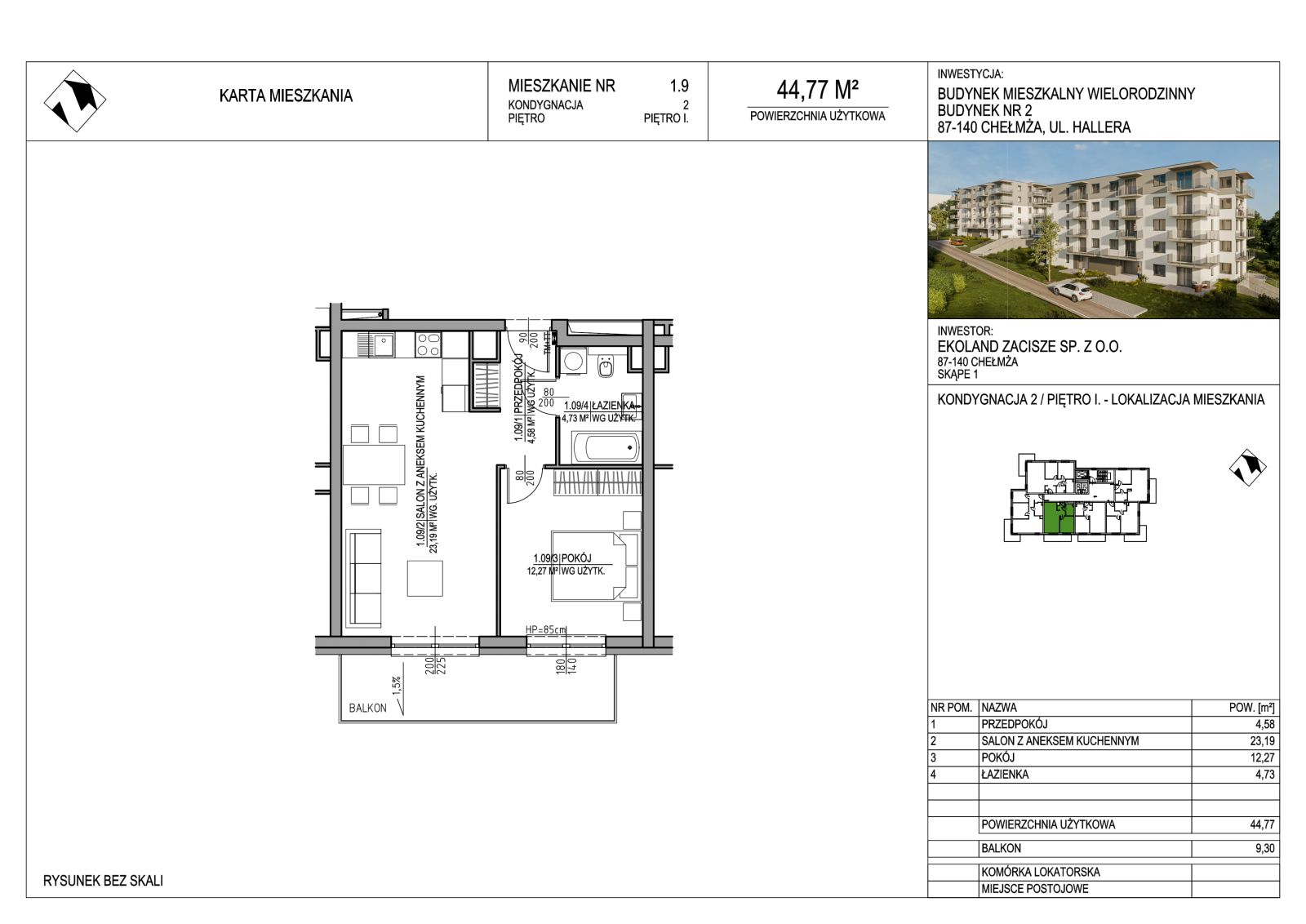 mieszkanie nr 1.9 o pow. 44,77m2 - I PIĘTRO